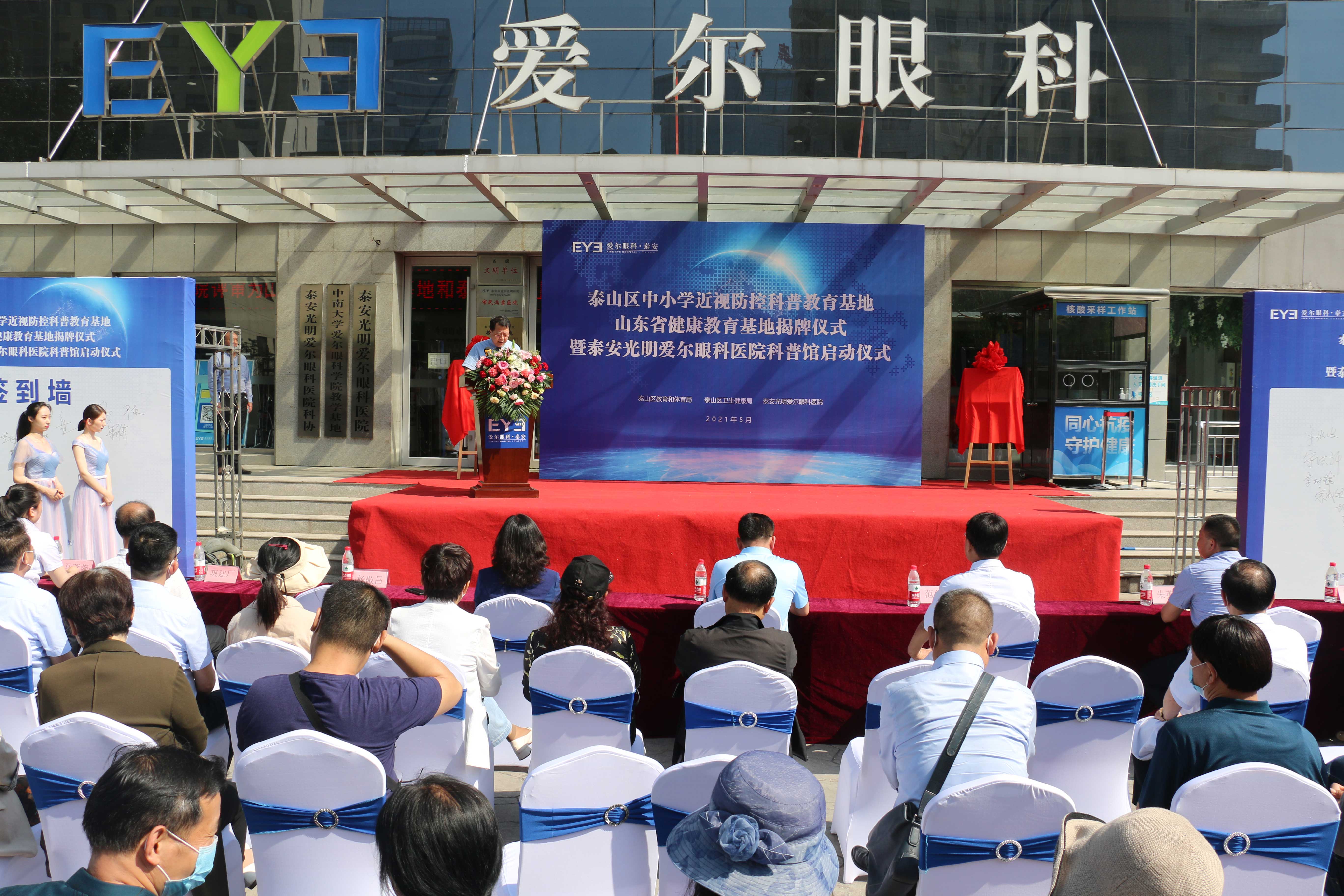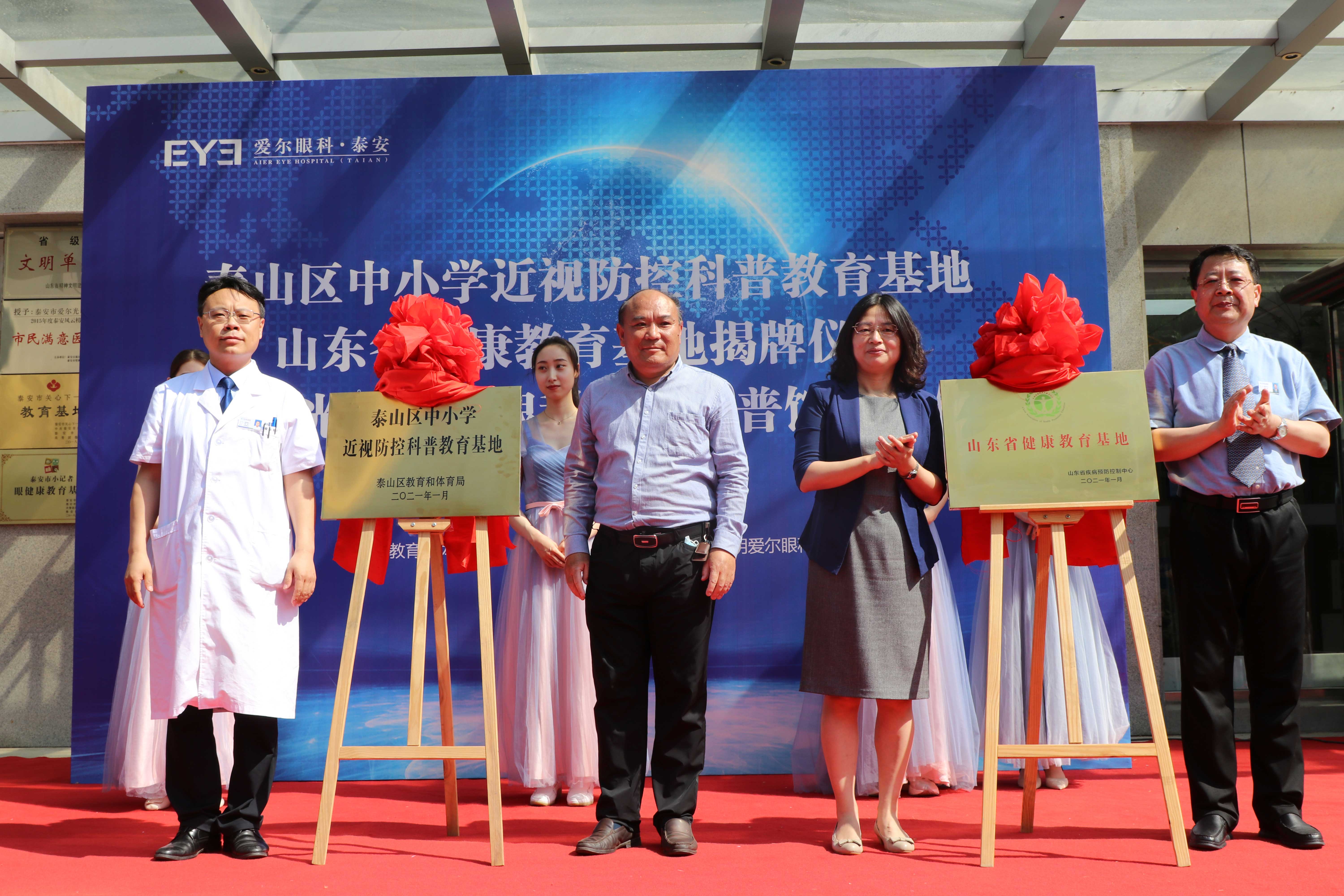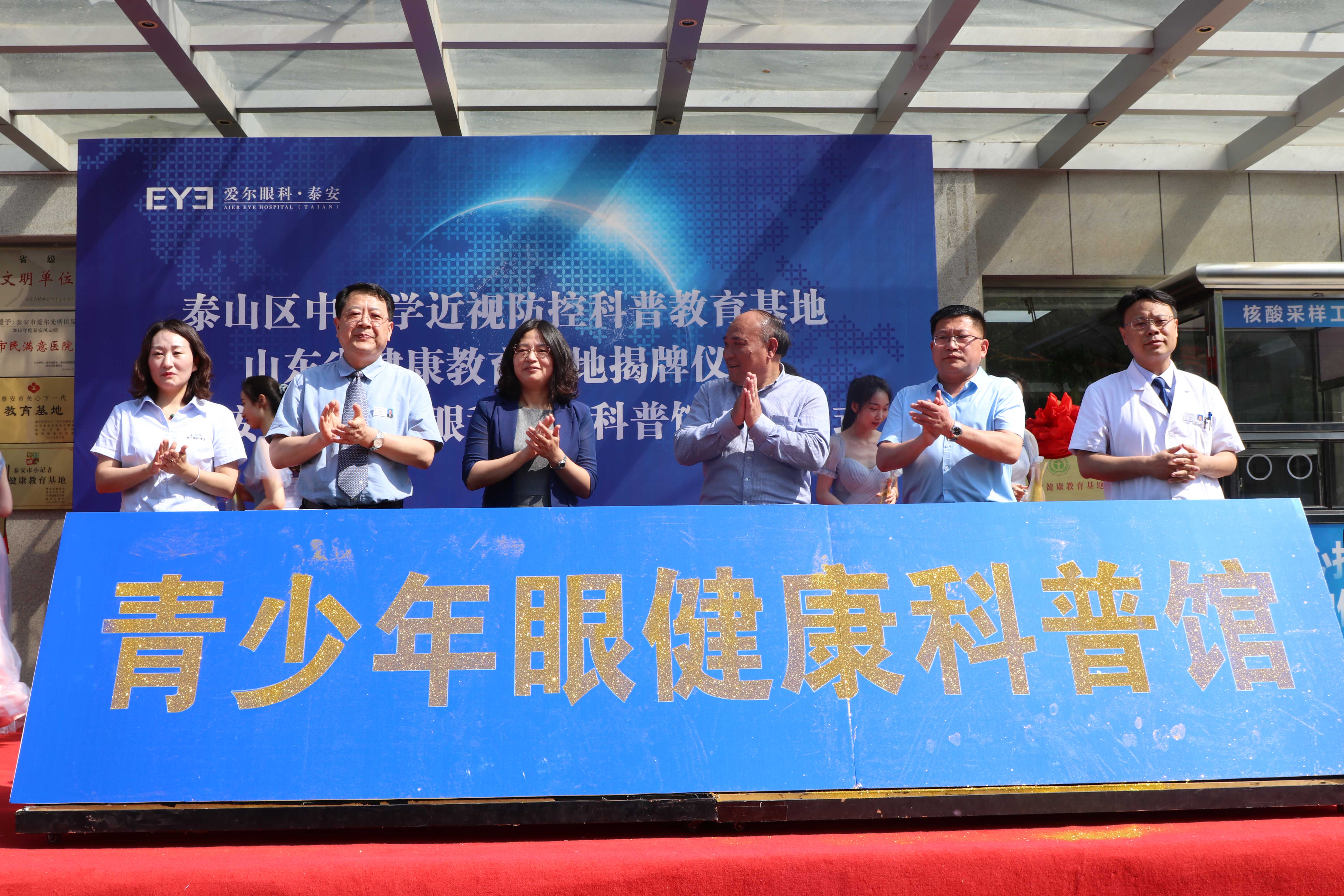 ? ? ? ?九點(diǎn)二十分,“山東省健康教育基地”和“泰山區(qū)中小學(xué)近視防控科普教育基地”正式揭牌。隨后,泰山區(qū)衛(wèi)生健康局黨組成員、副局長(zhǎng)寧方莉、泰山區(qū)教育和體育局副局長(zhǎng)高京杰、泰山區(qū)疾病預(yù)防控制中心副主任梁洪濤、泰安光明愛(ài)爾眼科醫(yī)院CEO楊敬昌、院長(zhǎng)范傳峰、社會(huì)公益部主任王海燕登臺(tái),宣布泰安市眼健康科普館正式啟動(dòng),并向市民免費(fèi)開(kāi)放。